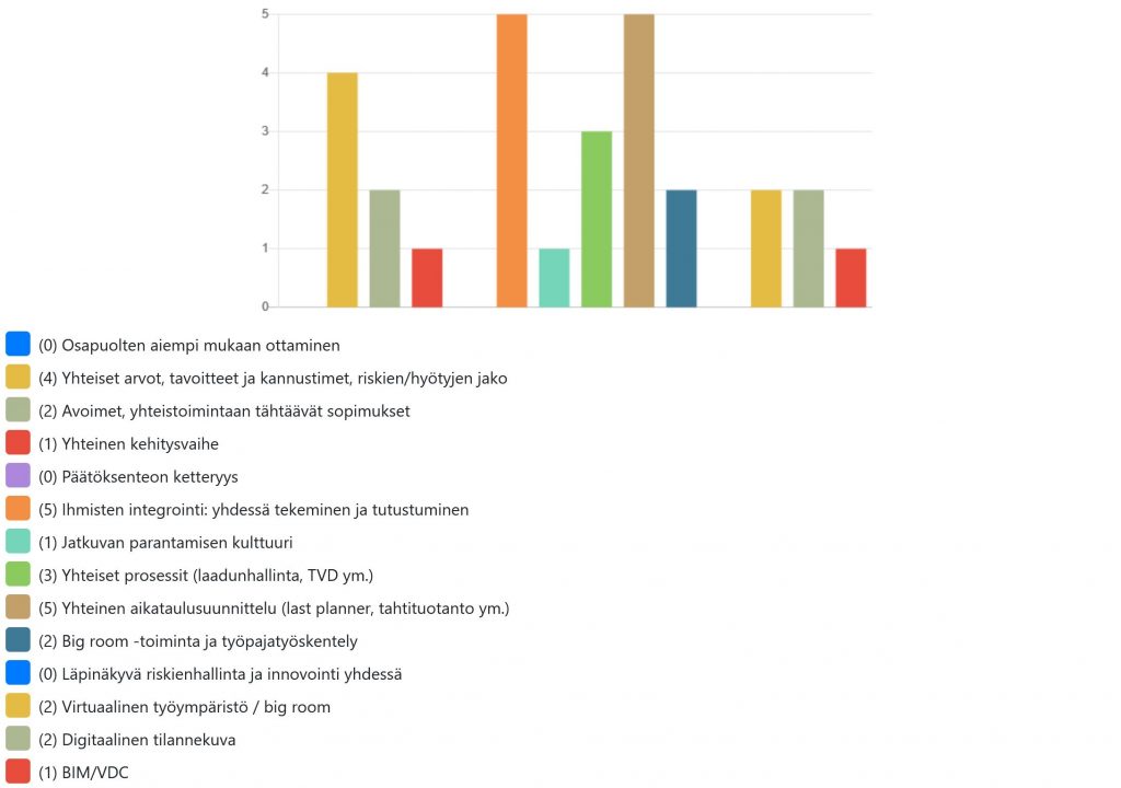 Esiin nousivat erityisesti ihmisten integrointi, yhteinen aikataulusuunnittelu ja yhteiset arvot, tavoitteet ja kannustimet. Integraatiomekanismeja voidaan käyttää pääsääntöisesti urakkamuodosta riippumatta. Sopimukselliset integraatiomekanismit vaativat kuitenkin sovittamista eri urakkamuotoihin. Alla olevassa kuvassa on esitetty erään pelisimulaatiotilanteen analyysi tilanteeseen sopivista integraatiomekanismeista.